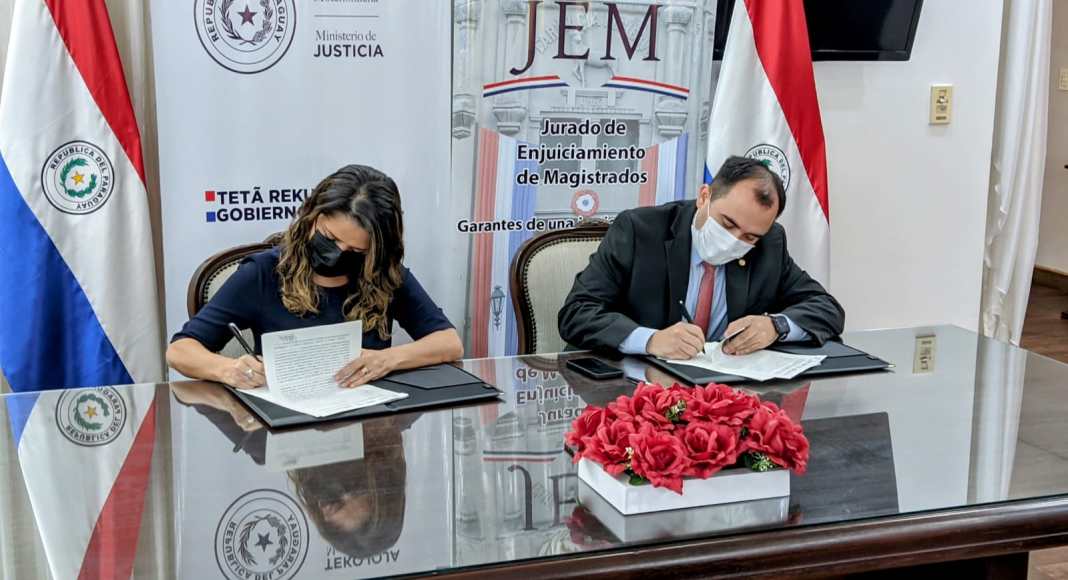 Jorge Bogarín González, presidente del Jurado de Enjuiciamiento de Magistrados JEM, firmó un acuerdo con la ministra de Justicia Cecilia Pérez, para recibir capacitación de dicho ministerio.